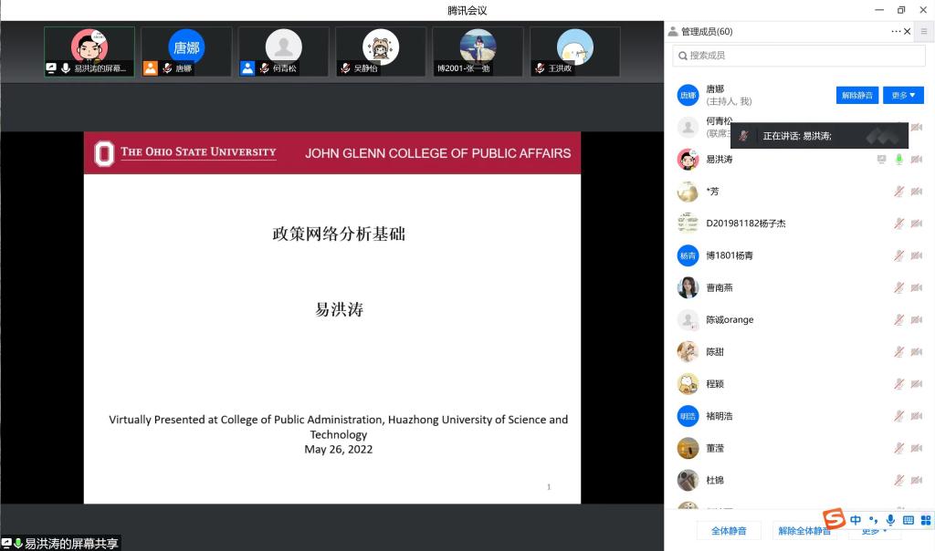 (通讯员 陈雨曦)5月27日上午,WilliamHill威廉希尔第二届“公共管理与政策前沿”工作坊第四期第一讲通过线上腾讯会议的方式举行。俄亥俄州立大学易洪涛副教授以“政策网络分析方法基础”为题,为我院近100名师生作精彩讲座,何青松副教授担任主持人。