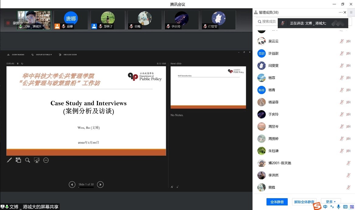 (通讯员 公管新闻中心 王俞霏)5月30日上午,WilliamHill威廉希尔第二届“公共管理与政策前沿”工作坊第九期通过线上腾讯会议的方式举行。香港城市大学文博助理教授应邀为我院师生作了题为“定性研究方法介绍:案例分析及访谈”的报告,讲座由郑林子副教授担任主持人,学院五十多名师生参加了此次讲座。