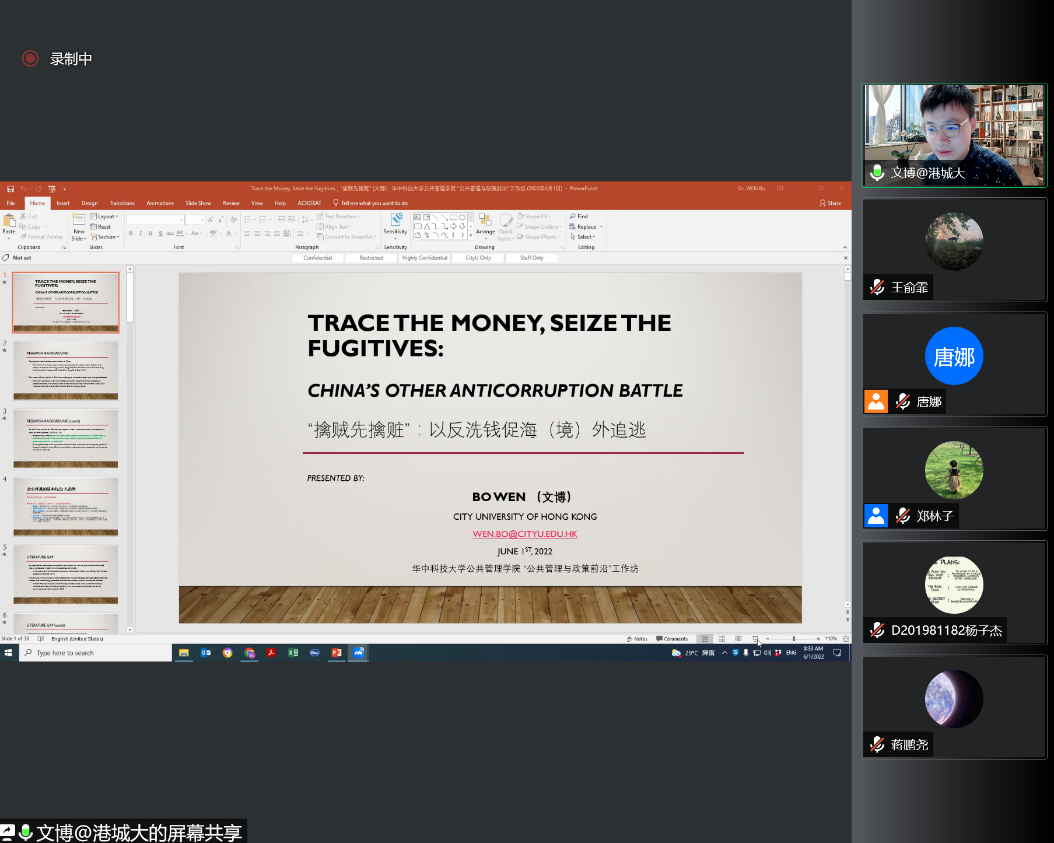 6月1日上午,WilliamHill威廉希尔第二届“公共管理与政策前沿”工作坊第五期通过线上腾讯会议的方式举行。香港城市大学文博助理教授以“‘擒贼先擒脏’:以反洗钱促海(境)外追逃——《当代中国》(Contemporary China)发文心得”为题,为我院五十多名师生作精彩讲座,郑林子副教授担任主持人。