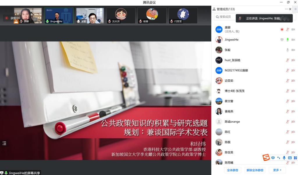 2022年12月22日晚七点,香港科技大学公共政策学部长聘副教授和经纬博士应邀为我院师生开展了一场题为《公共政策知识的积累与研究选题规划——兼谈国际学术发表》的线上讲座。本次学术讲座由唐娜老师主持,我院青年教师、硕博研究生、本科生近140人在线参会。