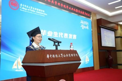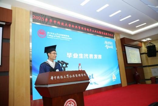 在毕业生代表发言环节,2205班班长曾倩回顾了在华科大求学的点滴时光,向学校、师长、同窗和家人表达诚挚感谢。她表示,华科大的学习经历不仅丰富了知识储备,更赋予了深厚的公共精神与责任担当。站在新的起点,MPA毕业生将继续秉持“公共之心”,铭记校训、接续奋斗,在推进中国式现代化进程中贡献青春力量。2306班班长丰潮以“感恩、珍惜、祝愿”为关键词,表达了对学校培养、学院支持和导师指导的真挚感谢,并表示这段学习经历不仅提升了专业素养,更锤炼了意志品格和自律精神。他号召全体毕业生立足本职、服务大局,努力成为政府决策的智囊团、社会发展的推动者,书写属于这一代人的精彩华章。