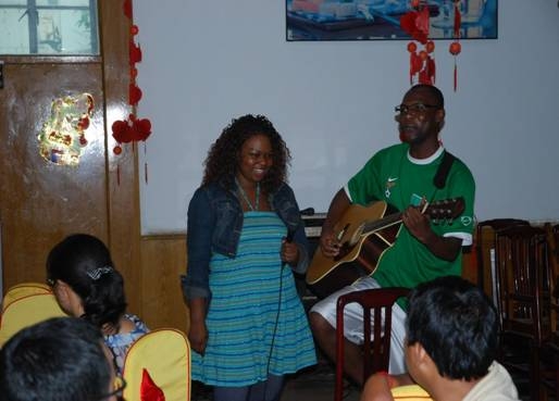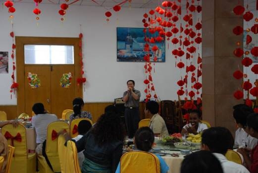 随后,来自巴西的Renato(任途)、柬埔寨的卫昆(Momvirak)等2010级留学生分别向大家做了自我介绍。留学生们的介绍虽然简短,却无不表达了他们对中国政府的感谢以及对中国文化的好奇和对中国留学生活的满意,虽然远离祖国和家乡,但是学院老师们的谆谆教导和无私帮助让他们感觉就像在自己的祖国一样,备感亲切。他们十分珍视来中国留学深造的机会,并对院领导和老师们的热情表示由衷的感谢。留学生们欢坐一堂,品尝着精心为他们准备的月饼、水果、茶点。会场其乐融融,新老生交流着自己在我校的学习和生活体验。会谈过程中,谭院长和老师们还不时细心地询问留学生们的学习、生活情况。为了表达对我院领导及老师们的感谢,留学生也表演了他们国家的特色节目,以表达对亲人的思念、对中外文化交流发展的美好祝愿。我院领导和老师也积极参与,把现场气氛推向了高潮。