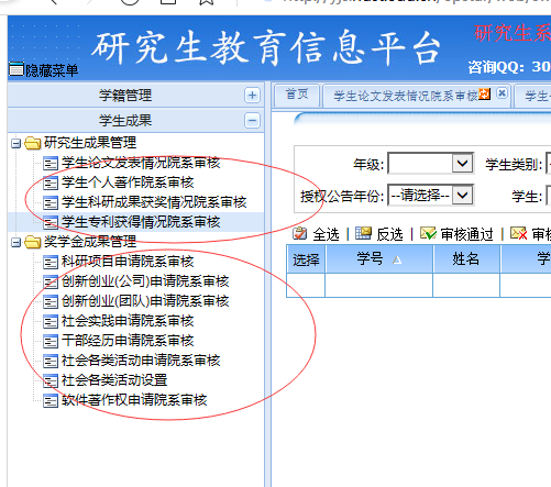 2、进入之后,点击学生成果,分别在“研究生成果管理”和“奖学金成果管理”里填写自己获得的成果,没有就不填。干部经历证明人填写我的工号:2019210094.成果不一定需要一次传完,分批上传也是可以的。