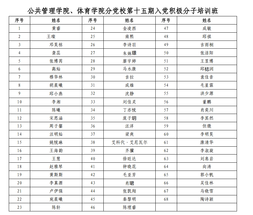 本期入党积极分子培训班共有学员68人,人员名单如下: