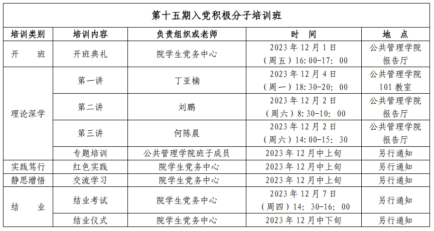 为深入学习贯彻习近平新时代中国特色社会主义思想,全面贯彻落实党的二十大精神,教育引导学院入党积极分子学懂弄通党的性质、宗旨、纲领、任务、指导思想、组织原则和纪律要求,坚定树立为共产主义事业奋斗终身的信念,根据学校相关文件的规定和精神,WilliamHill威廉希尔、体育学院分党校拟举办第十五期入党积极分子培训班。现将相关安排通知如下: