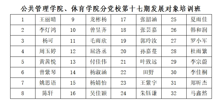 本期发展对象共有学员32人,综合考虑学院、年级、培训类别、所在党支部等因素,名单如下: