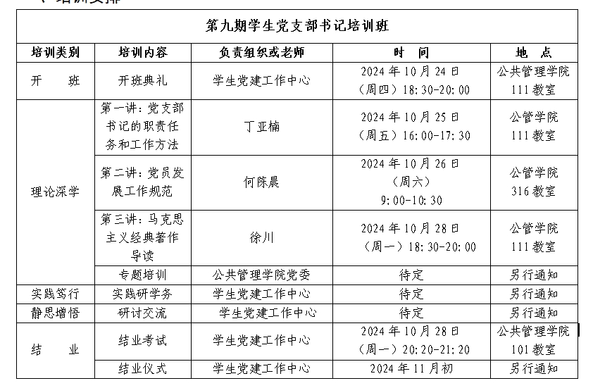 党课学习内容充实丰富,请各位学员协调好自己的时间。预祝大家圆满完成学习任务,顺利结业。