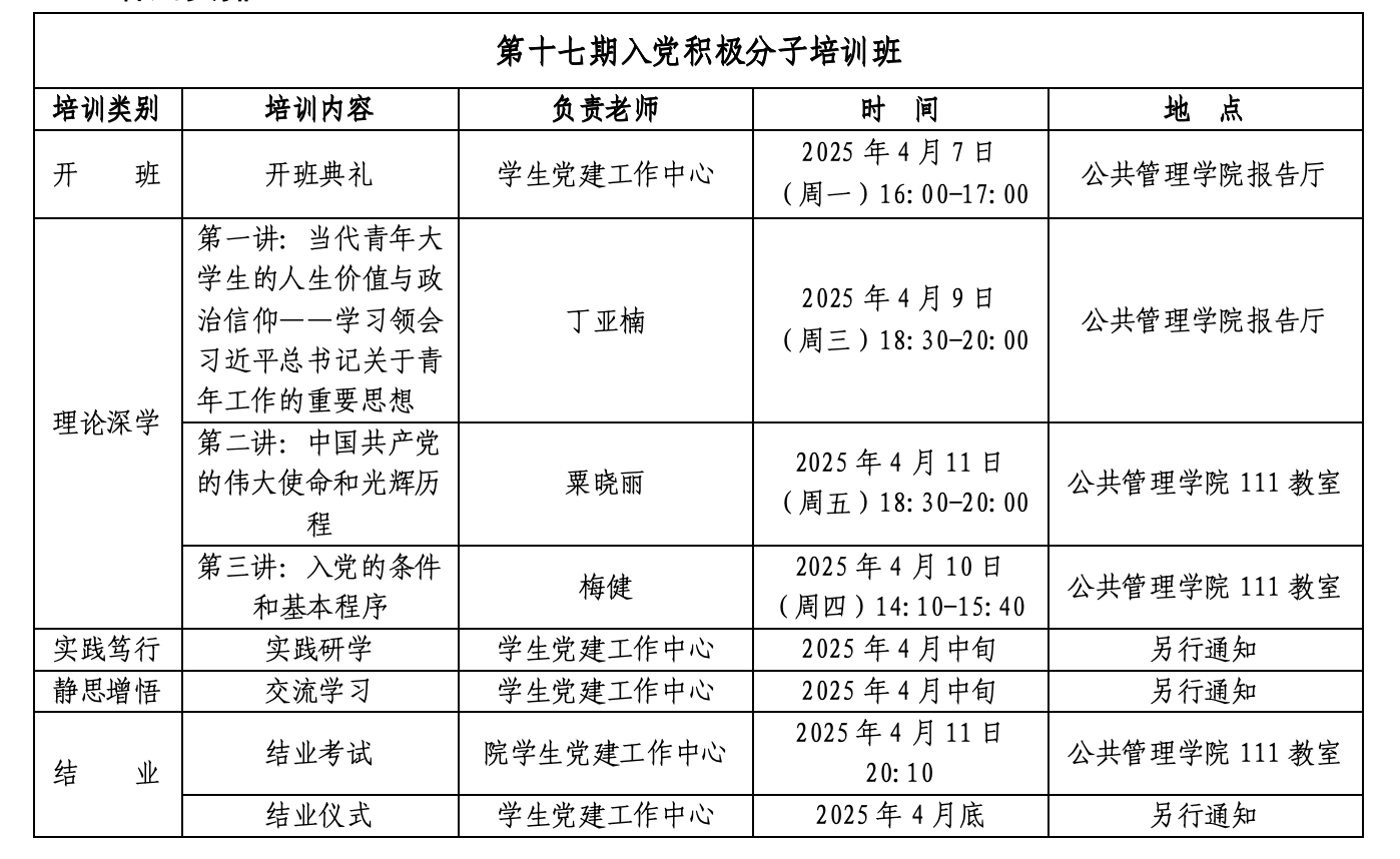 党课学习内容充实丰富,请各位学员协调好自己的时间。预祝大家圆满完成学习任务,顺利结业。