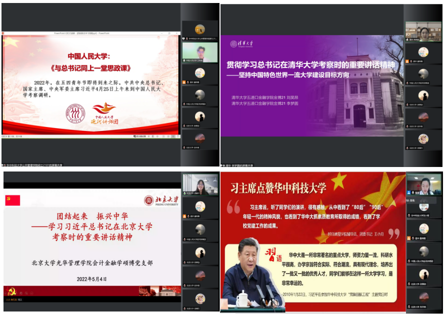 为深入学习领会习近平总书记在中国人民大学考察调研时的讲话精神,从习近平总书记对广大青年学子的殷切寄语中汲取奋进力量,2022年5月4日,我院硕士2101党支部和清华大学五道口金融学院金博21党支部、北京大学光华管理学院会计金融学硕博党支部、中国人民大学外国语学院21级硕士生第二党支部于线上开展了联学交流活动,系统学习了习近平总书记考察各高校时的重要讲话精神。四校研究生党支部共90余名党员、入党积极分子参与了本次活动。活动由我院硕士2101党支部书记董滢同志主持。