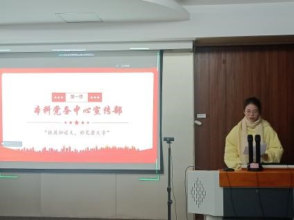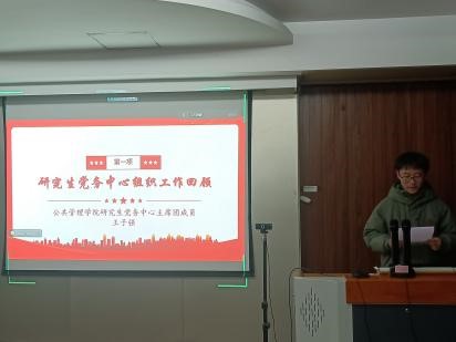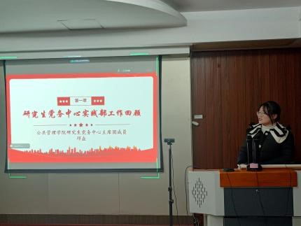 研究生党务中心组织部负责人王子强从思想工作、组织工作、支部工作三个方面进行回顾。纪检部负责人石祯总结了部门常规性检查、党史知识竞赛、主题实践活动等的开展情况。实践部负责人邓垚分享了部门创新性的工作形式,重点介绍了“寻访红色荆楚,思悟革命精神”和红色Citywalk活动的开展情况。