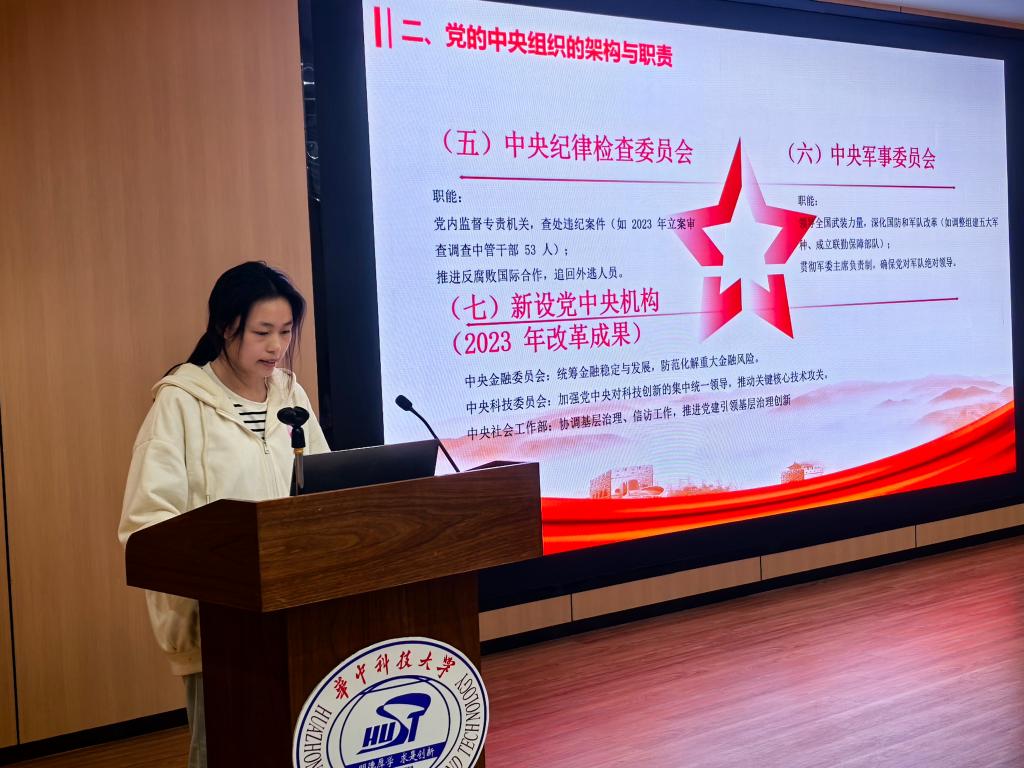 柳婷从学科专业的视角,针对不同小组讲解的内容提出对应问题,引导大家进一步深入思考党章修改的深刻涵义与政治意义。她强调,党章既是一部法规,也是理解中国共产党的一本教材,作为一名公管学子,应从党章中学会解读中国共产党的组织架构与执政逻辑,从而在日常学习与生活中能深刻认识国家治理与社会发展的政治实践。她进一步指出,以思维导图的方式把握党章的逻辑脉络、以具体案例的方式解读党章的条文内容,有利于把握好党章学习的严肃性与生动性的平衡。