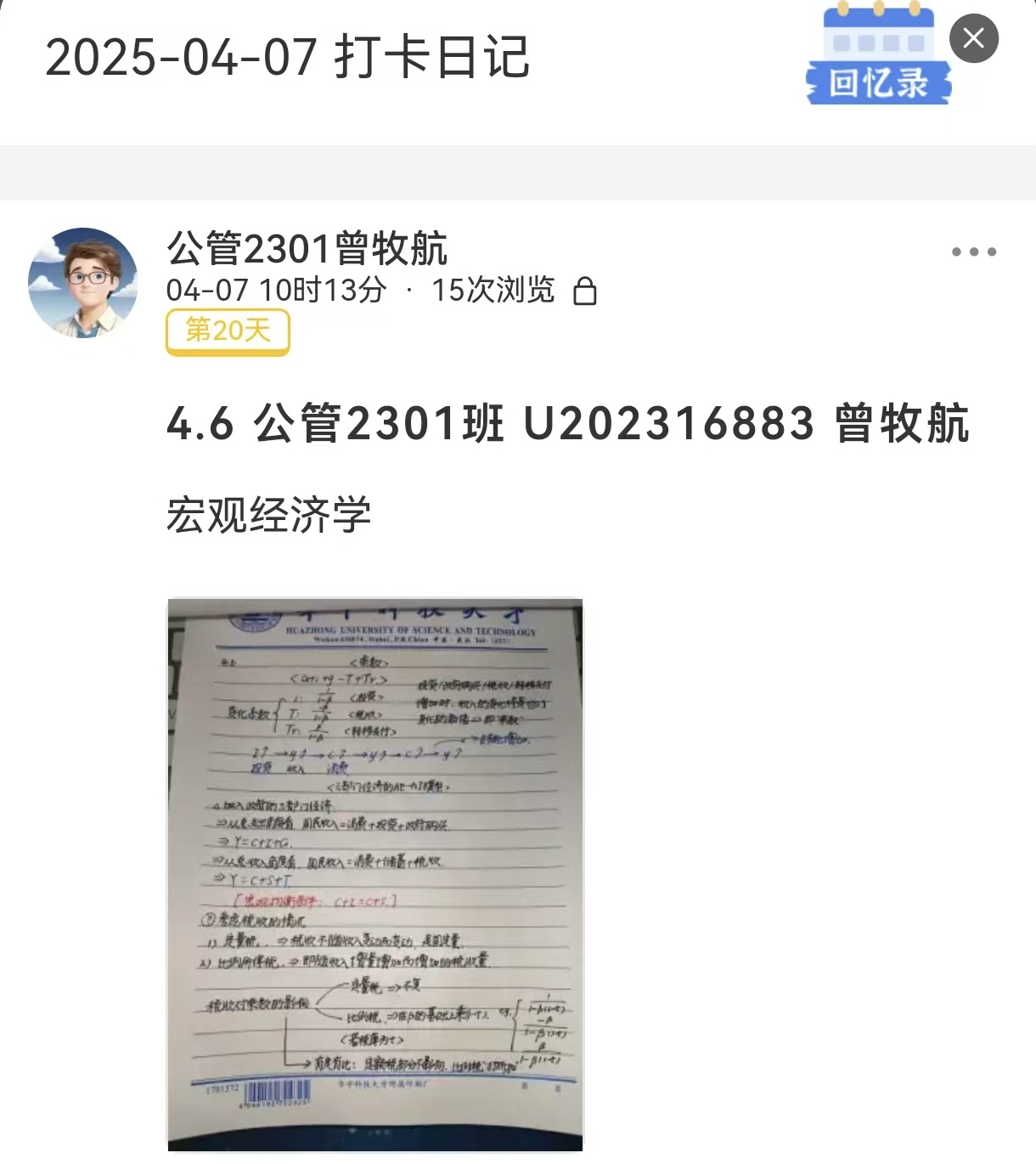 打卡初期我习惯性地“照本宣科”,但后来发现真正高效的笔记是对知识的再创造,做笔记更像是和知识“对话”。在做《宏观经济学》笔记时,我尝试用自己的语言重新表述每一个原理,配合实际案例加以解释,不仅增强了记忆,也提高了分析能力。