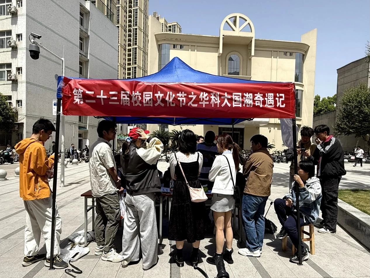 4月13日,路演活动于东操场和紫菘路口同时进行,现场气氛热烈。同学们参与互动游戏,抽取精美奖品,充分了解“华科大国潮奇遇记”。
