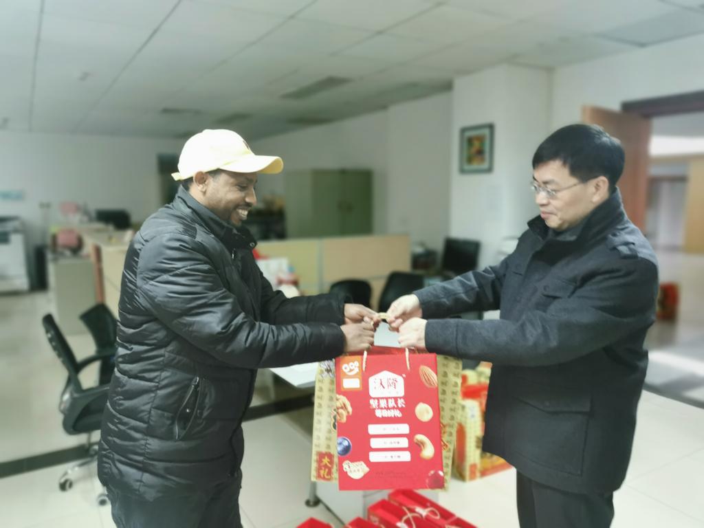 会后,院领导为留校学生送上春节大礼包,寄语新春的祝福,并与留校学生合影留念。