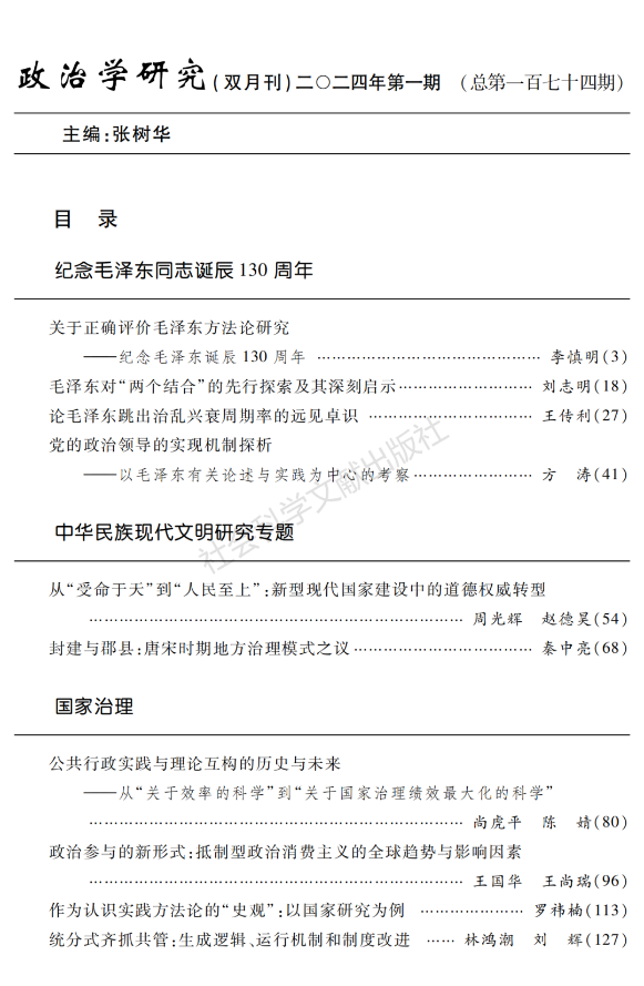 《政治学研究》(CASS Journal of Political Science)是由中国社会科学院主管,中国社会科学院政治学研究所主办的政治学专业学术理论刊物,被国家哲学社会科学学术期刊数据库等收录,多次是中文社会科学引文索引来源期刊,北京大学《中文核心期刊要目总览》来源期刊。它以马克思主义政治学研究为主,追踪报道政治学重大理论和实践问题、理论前沿和学术热点,设有学术前沿、学术资讯、治理研究等栏目。