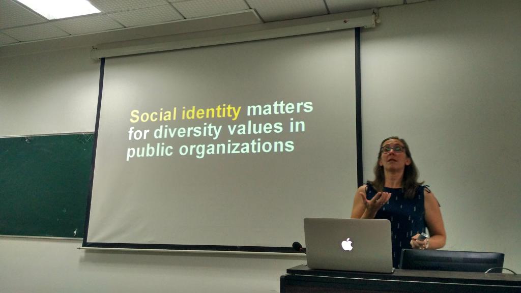Mary副教授从种族和性别两个维度着手,结合一系列理论数据和实际案例,向大家介绍了当前美国公共价值的多元化现状。她指出,通过其研究团队历时十年走访美国地方政府进行调研,发现与美国社会种族和性别方面的价值多元化特征不同,种族和性别多样性在地方政府公职人员就业现状中并不突出,少数族裔和女性在地方政府公职人员中的占比仍然较低。接着,通过实证研究和统计学分析,她向大家展示了社会身份、群体文化、社区多样性对公共组织价值多元发展影响显著,并强调要着重加强群体内价值多元化建设来丰富地方政府公共价值。