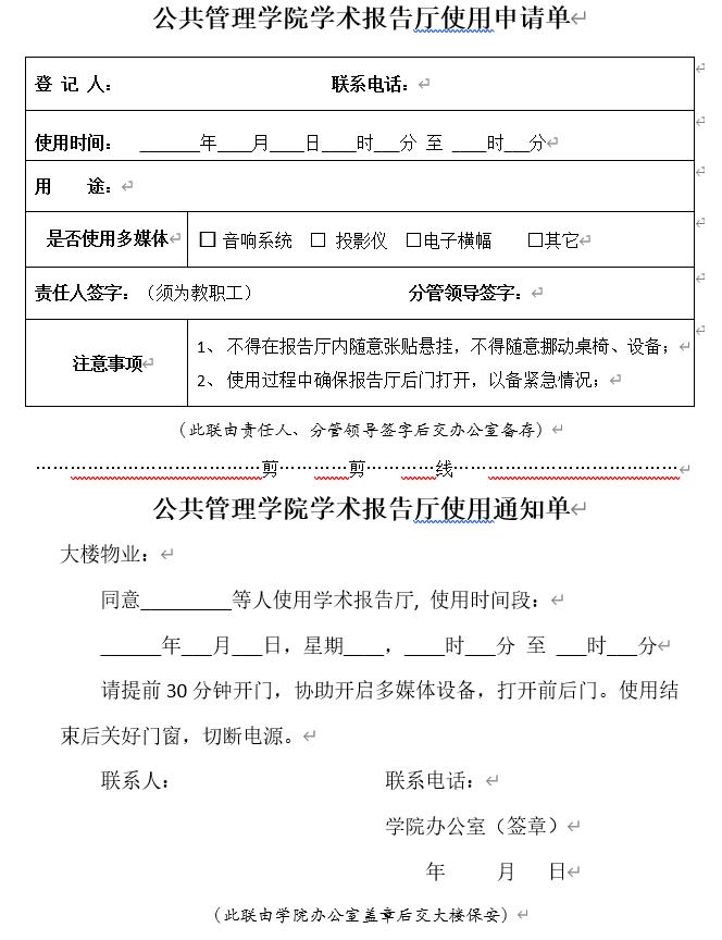 2、填写《WilliamHill威廉希尔学术报告厅使用申请表》,借用责任人(必须是教工)签字留办公室存档。附联《WilliamHill威廉希尔学术报告厅使用通知单》信息填写完整后请童文胜副书记签字,院办盖章后交大楼一楼保安门岗,保安在使用前开门。