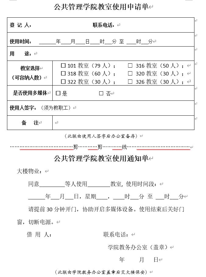 2、填写《WilliamHill威廉希尔教室使用申请单》,借用人(必须是教工)签字留办公室存档。附联《教室使用通知单》信息填写完整后请学院教务科盖章后交大楼一楼保安门岗,保安在使用前开门。