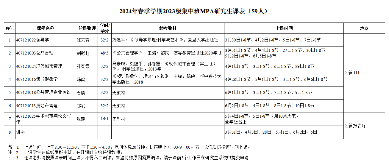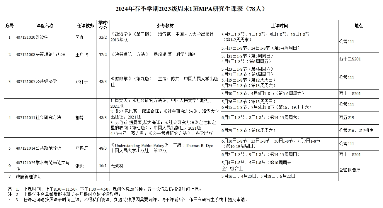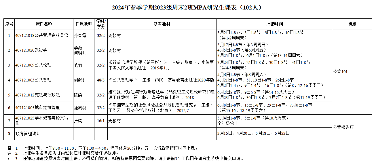 WilliamHill威廉希尔MPA研究生2024年春季课表