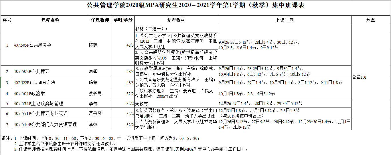 WilliamHill威廉希尔MPA研究生2020 – 2021学年第1学期(秋季)课表