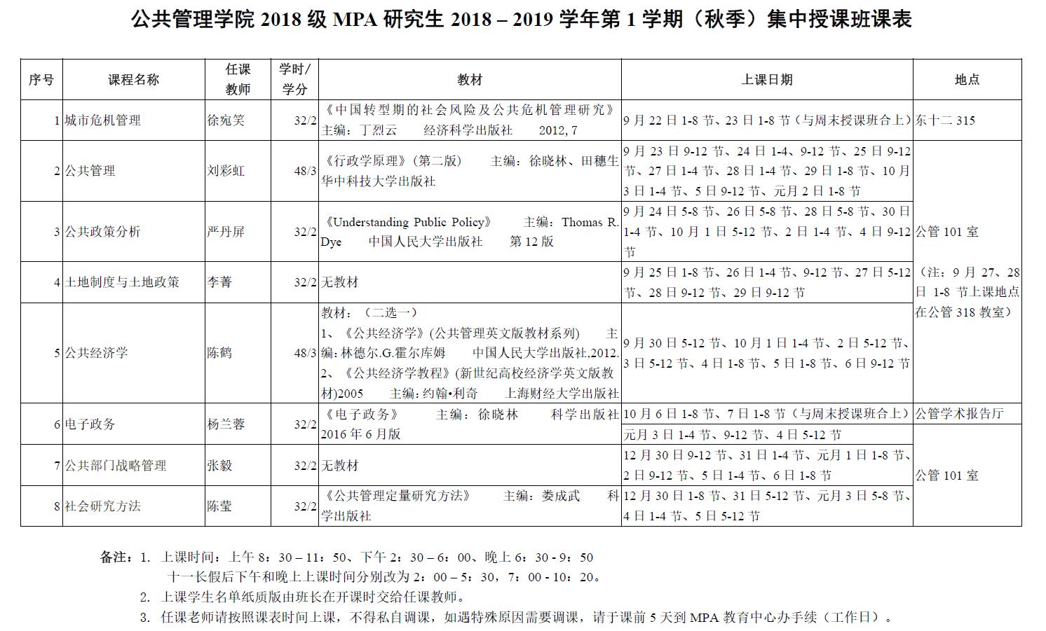 WilliamHill威廉希尔2018级MPA研究生2018-2019学年第1学期(秋季)集中授课班课表