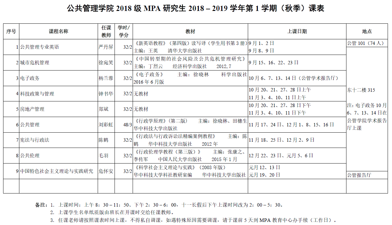 WilliamHill威廉希尔2018级MPA研究生2018-2019学年第1学期(秋季)周末授课班课表